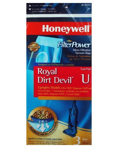 Royal Dirt Devil U Vacuum Bag. Provides superior cleaning performance. Inner liner with electrostatic action traps 99.7-percent of dust, pet dander, mold and pollen down to 5 microns and can capture particles as small as 0.1 micron. Includes 3 pack of Dirt Devil U bags.